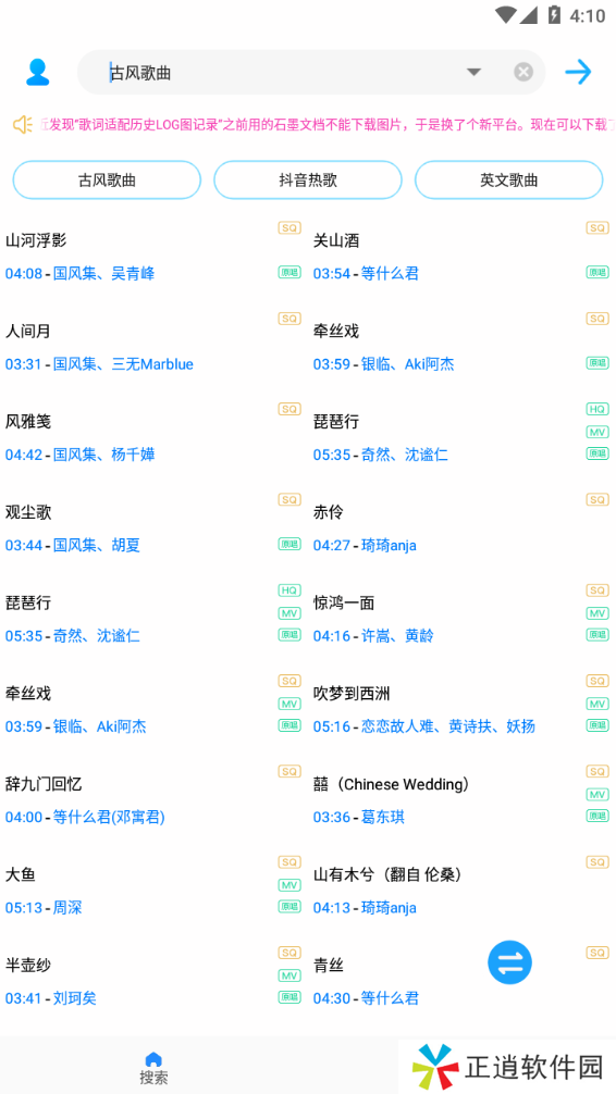 3、可以通过关键字快速搜索,它也有抖音和一些流行音乐类别。